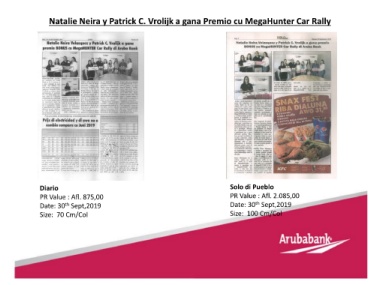 Natalie Neira y Patrick C. Vrolijk a gana Premio cu MegaHunter Car Rally Diario Solo di Pueblo PR Value : Afl. 875,00 PR Value : Afl. 2.085,00 th Date: 30 Sept,2019 Date: 30 Sept,2019 th Size: 70 Cm/Col Size: 100 Cm/Col