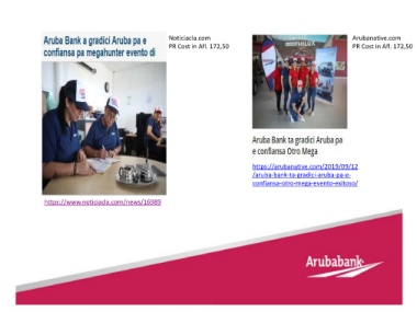 Noticiacla.com Arubanative.com PR Cost in Afl. 172,50 PR Cost in Afl. 172,50 https://arubanative.com/2019/09/12 /aruba-bank-ta-gradici-aruba-pa-e- confiansa-otro-mega-evento-exitoso/ https://www.noticiacla.com/news/16989