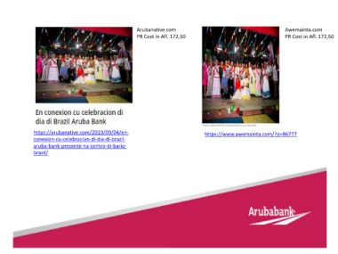 Arubanative.com Awemainta.com PR Cost in Afl. 172,50 PR Cost in Afl. 172,50 https://arubanative.com/2019/09/04/en- https://www.awemainta.com/?p=86777 conexion-cu-celebracion-di-dia-di-brazil- aruba-bank-presente-na-centro-di-bario- brazil/