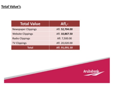 Total Value’s: Total Value Afl,- Newspaper Clippings Afl. 52,704.00 Website Clippings Afl. 10,867.50 Radio Clippings Afl. 7,500.00 TV Clippings Afl. 20,020.00 Total Afl. 91,091.50