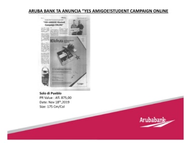ARUBA BANK TA ANUNCIA “YES AMIGOE!STUDENT CAMPAIGN ONLINE Solo di Pueblo PR Value : Afl. 875,00 th Date: Nov 18 ,2019 Size: 175 Cm/Col