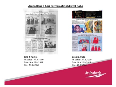 Aruba Bank a haci entrega oficial di vest nobo Solo di Pueblo Bon dia Aruba PR Value : Afl. 675,00 PR Value : Afl. 825,00 Date: Nov 22th,2019 Date: Nov 22th,2019 Size: 55 Cm/Col Size: 65 Cm/Col