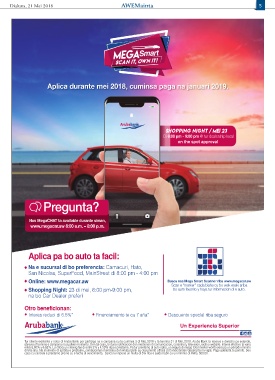 Tur cliente existente y nobo di Aruba Bank por participa na e campana cu ta cuminsa 3 di Mei, 2018 y ta termina 31 di Mei, 2018. Aruba Bank ta reserva e derecho pa extende,