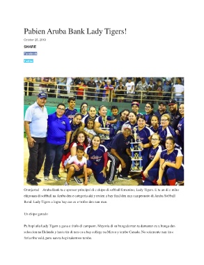 Oranjestad – Aruba Bank ta e sponsor principal di e ekipo di softball femenino, Lady Tigers. E ta un di e miho