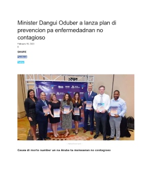 Minister Dangui Oduber a lanza plan di prevencion pa enfermedadnan no contagioso February 18, 2020 0 SHARE Facebook Twitter - Advertisement - Causa di morto number un na Aruba ta malesanan no contagioso