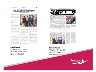 Awe Mainta Bon dia Aruba PR Value : Afl. 2.188,00 PR Value : Afl. 655,00 th Date: 12 June,2019 Date: 12 June,2019 th Size: 175 Cm/Col Size: 55 Cm/Col