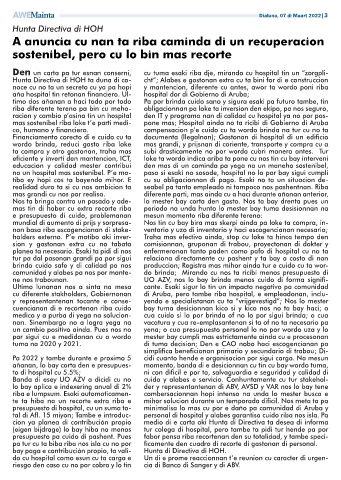 mas sostenibel riba loke t’e parti medi- pone mas; Hospital ainda no ta ricibi di Gobierno di Aruba