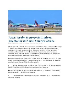 ORANJESTAD – Aruba ta proyecta 1 miyon asiento for di Norte America atrobe, esta pa