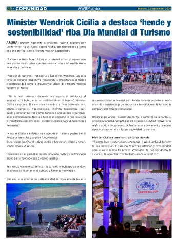 Minister Cicilia a enfatisa cu e agenda di turismo sostenibel di