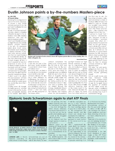 at a scoreboard all day, ei- Masters golf champion Dustin Johnson shows off his green jacket after his victory Sunday, Nov. 15, to get Johnson to explain