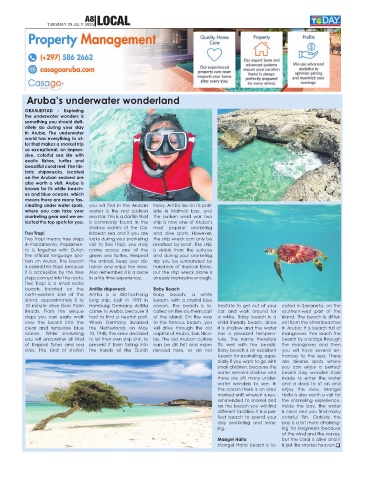 ocean.  While  snorkeling  10, 1940, the crew decided  capital of Aruba, San Nico-     has  a  pleasant  tempera-   mangroves. You reach the
