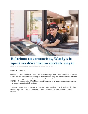 ORANJESTAD – Wendy’s Aruba a informa dialuna pa medio di un comunicado, cu nan