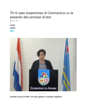 Tin 6 caso sospechoso di Coronavirus cu ta pasando den proceso di test March 16, 2020 0 SHARE Facebook Twitter - Advertisement - Jurette Croes di DVG: 19 caso getest a resulta negativo