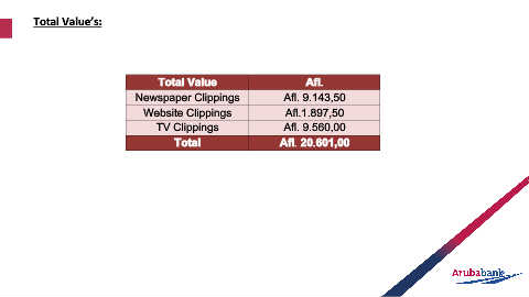 Total Value’s:: Total Value Afl. Newspaper Clippings Afl. 9.143,50 Website Clippings Afl.1.897,50 TV Clippings Afl. 9.560,00 Total Afl. 20.601,00