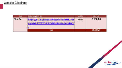 Website Clippings: Radio CLICK on description for Link Min & Sec PR Cost in Afl. Blue Fm https://drive.google.com/open?id=1JTY27SS 7min 2.500,00 Aly99XIvRWFGYzSuPYMeJmJNt&usp=drive_f s Total Afl. 2.500,00