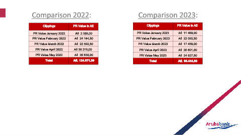 PR Value April 2022 Afl.36.219,00 PR Value April 2023 Afl. 20.601,00