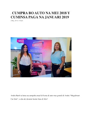 . CUMPRA BO AUTO NA MEI 2018 Y CUMINSA PAGA NA JANUARI 2019 3 May, 2018, 1:49 pm 632 Aruba Bank ta lansa su campaña anual di benta di auto mas grandi di Aruba “MegaSmart Car Sale”, e aña aki durante henter luna di Mei!