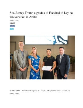 Sra. Jurney Tromp a gradua di Facultad di Ley na Universidad di Aruba February 6, 2020 SHARE Facebook Twitter ORANJESTAD – Recientemente a gradua di e Facultad di Ley na Universidad di Aruba Sra. Jurney Tromp