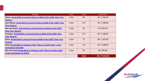 Extra: Aruba Bank ta anuncia fecha pa Walk & Run 2025: Own Your                                                                                                          Color                               75                                     Afl. 1.295,00