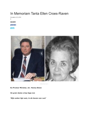 In Memoriam Tanta Ellen Croes-Raven December 28, 2019 0 SHARE Facebook Twitter - Advertisement - Ex Promer Minister, mr. Henny Eman Un gran dama a bay laga nos ‘Mijn anker ligt vast, in de haven van rust’