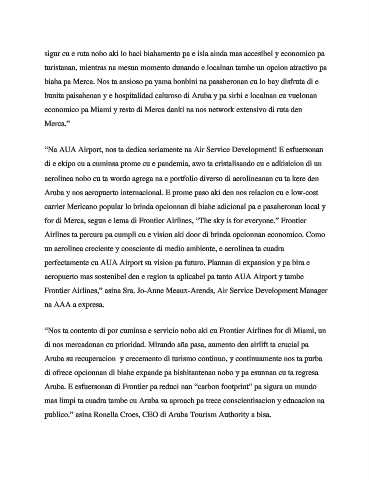 “Nos ta contento di por cuminsa e servicio nobo aki cu Frontier Airlines for di Miami, un