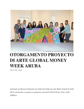 OTORGAMENTO PROYECTO DI ARTE GLOBAL MONEY WEEK ARUBA 2 March, 2020, 4:35 pm 95 Aportando na educacion financiero na Aruba den ultimo dos aña, Banco Central di Aruba (BCA) anualmente ta organisa un programa nacional di Global Money Week Aruba (GMWA).