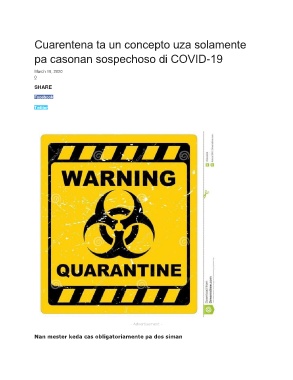 Cuarentena ta un concepto uza solamente pa casonan sospechoso di COVID-19 March 19, 2020 0 SHARE Facebook Twitter - Advertisement - Nan mester keda cas obligatoriamente pa dos siman