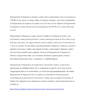 di Impuesto ta funda riba prevencion di propagacion di COVID-19 y ta tuma esaki hopi