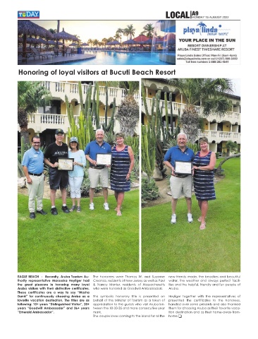 EAGLE BEACH - Recently, Aruba Tourism Au- The honorees were Thomas W. and Suzanne new friends made, the beaches and beautiful