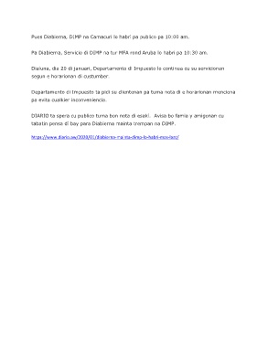 Pues Diabierna, DIMP na Camacuri lo habri pa publico pa 10:00 am.
