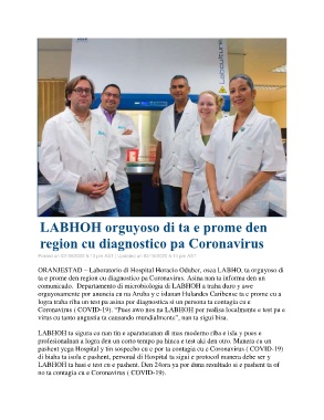 ta e prome den region cu diagnostico pa Coronavirus. Asina nan ta informa den un