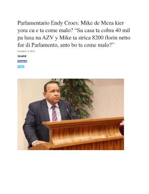 Parlamentario Endy Croes: Mike de Meza kier yora cu e ta come malo? “Su casa ta cobra 40 mil pa luna na AZV y Mike ta strica 8200 florin netto for di Parlamento, anto bo ta come malo?” November 3, 2019 SHARE Facebook Twitter