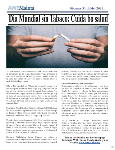 Tur aña riba dia 31 di mei ta enfoca riba e consecuencianan pulmon y e berdad ta cu den 86% di e casonan di cancer