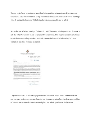 Aunke Prome Minister a sali pa Hulanda di 19 di November, el a laga un carta firma cu a