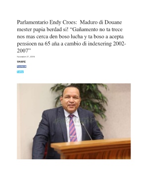Parlamentario Endy Croes: Maduro di Douane mester papia berdad si! “Gañamento no ta trece nos mas cerca den boso lucha y ta boso a acepta pensioen na 65 aña a cambio di indexering 2002- 2007” November 21, 2019 SHARE Facebook Twitter