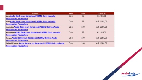 Awe Mainta:Aruba Bank cu un donacion di 100MIL florin na Aruba                                                                                                            Color                             100                                      Afl. 1.050,00