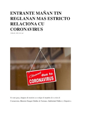 ENTRANTE MAÑAN TIN REGLANAN MAS ESTRICTO RELACIONA CU CORONAVIRUS 18 March, 2020, 9:31 pm 40 Un rato pasa, despues di reunion cu e ekipo di maneho di e crisis di Coronavirus, Minister Dangui Oduber di Turismo, Salubridad Publico y Deporte a