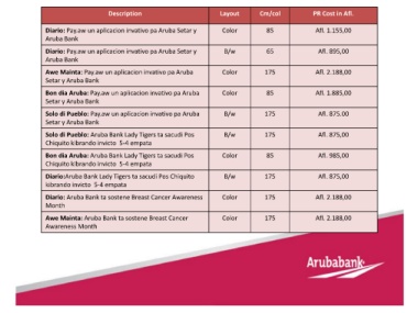 Description Layout Cm/col PR Cost in Afl.