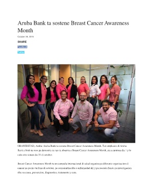 ORANJESTAD, Aruba: Aruba Bank ta sostene Breast Cancer Awareness Month. Tur empleado di Aruba