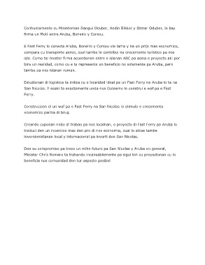 Creando cuponan nobo di trabao pa nos localnan, e proyecto di Fast Ferry pa Aruba lo