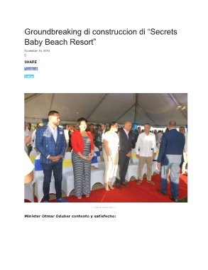 Groundbreaking di construccion di “Secrets Baby Beach Resort” November 15, 2019 0 SHARE Facebook Twitter - Advertisement - Minister Otmar Oduber contento y satisfecho:
