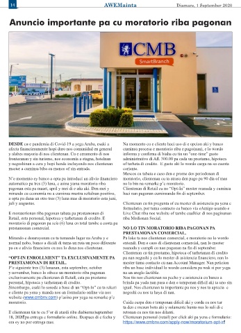 N’e momento ey banco a opta pa introduci un alivio financiero moratorio, clientenan cu ta atrasa den pago pa 90 dia of mas
