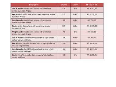 Description Cm/col Layout PR Cost in Afl.
