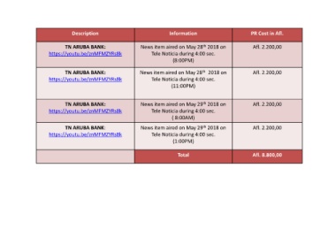 TN ARUBA BANK: News item aired on May 29 2018 on Afl. 2.200,00