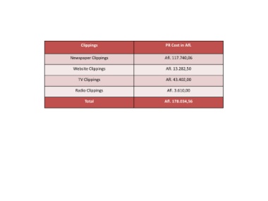Clippings PR Cost in Afl. Newspaper Clippings Afl. 117.740,06 Website Clippings Afl. 13.282,50 TV Clippings Afl. 43.402,00 Radio Clippings Afl. 3.610,00 Total Afl. 178.034,56