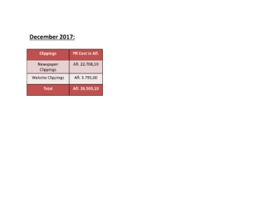December 2017: Clippings PR Cost in Afl. Newspaper Afl. 22.708,10 Clippings Website Clippings Afl. 3.795,00 Total Afl. 26.503,10