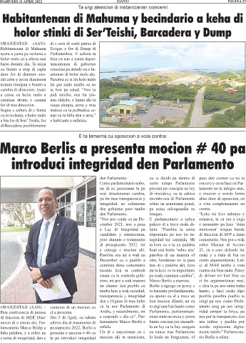 e tema di integridad, den e ta pa introduci integridad mocion aki ta menciona, lo keda na berguenza, of rio Berlis a relata.