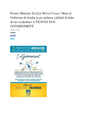 Prome Minister Evelyn Wever-Croes: Meta di Gobierno di Aruba ta pa mehora calidad di bida di tur ciudadano A TRAVES DI E- GOVERNMENT February 5, 2020 SHARE Facebook Twitter