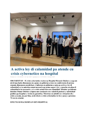 ORANJESTAD – E crisis cybernetico recien na Hospital Horacio Oduber a yega un
