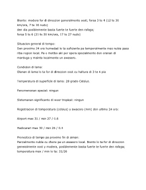 Biento: modera for di direccion generalmente oost; forsa 3 te 4 (12 te 30